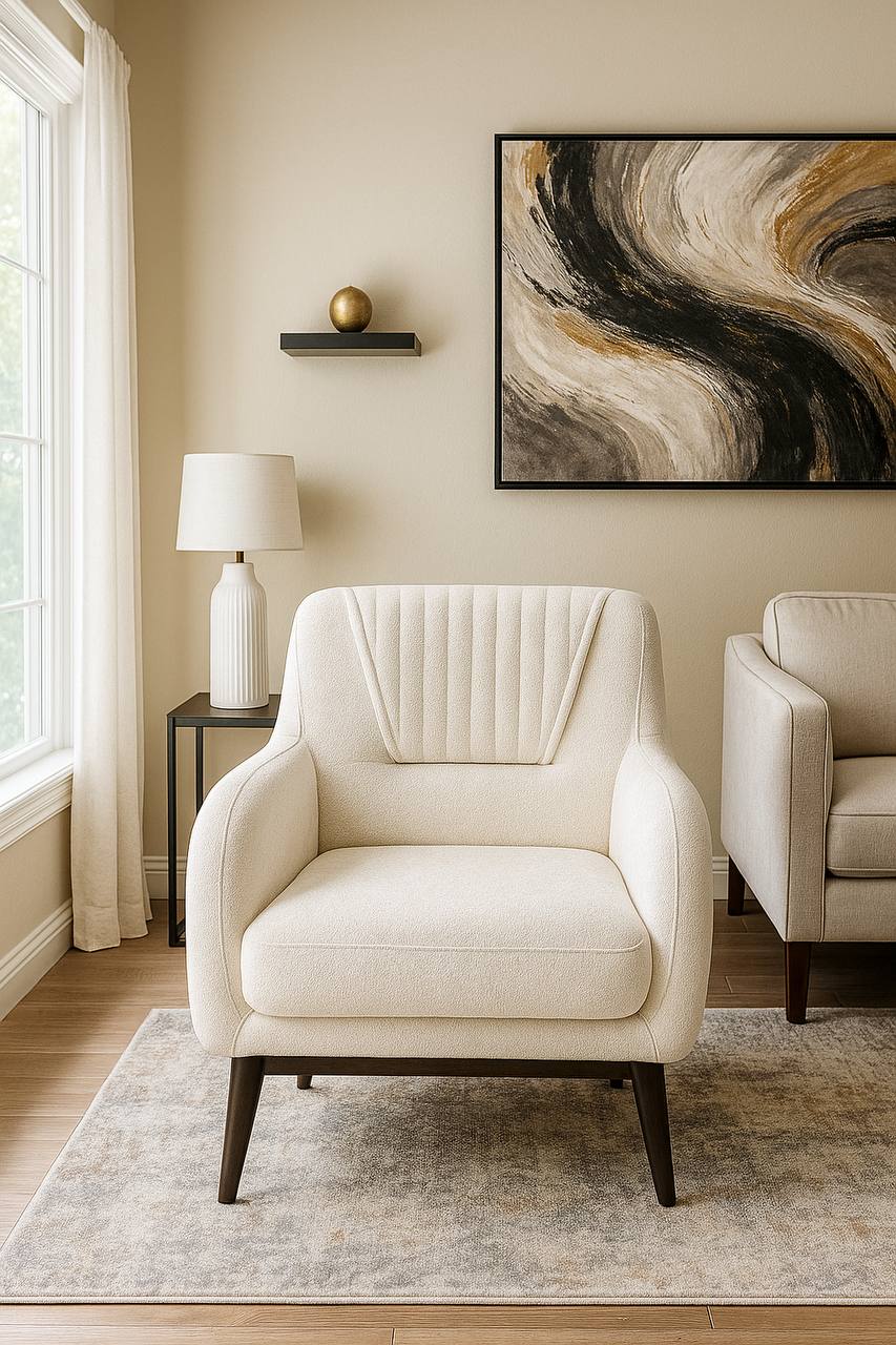 طراحی: فرم ارگونومیک و نشیمن راحت، در کنار جزئیاتی مانند دوختهای دقیق و پایههای چوبی تیرهرنگ، این مبل را به یک اثر هنری تبدیل کرده است. ترکیب رنگهای خنثی با المانهای طلایی و مشکی، امکان هماهنگی با انواع سبکهای دکوراسیون را فراهم میکند.